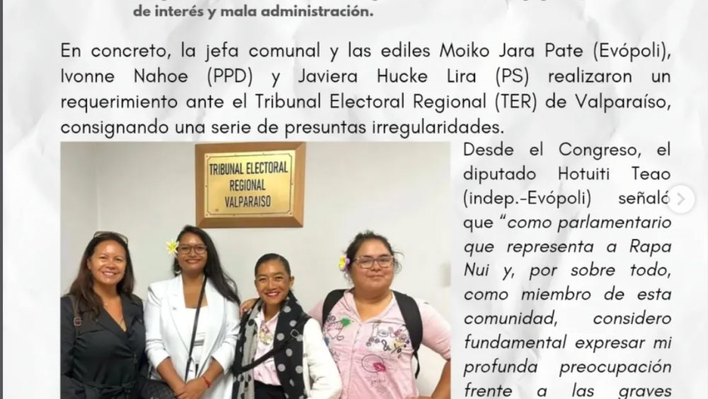 Valoro profundamente el liderazgo de la alcaldesa Arévalo Pakarati y el trabajo conjunto que hemos impulsado como concejo municipal para esclarecer estos hechos . Este paso no responde a diferencias políticas, sino a un deber ético con Rapa Nui.